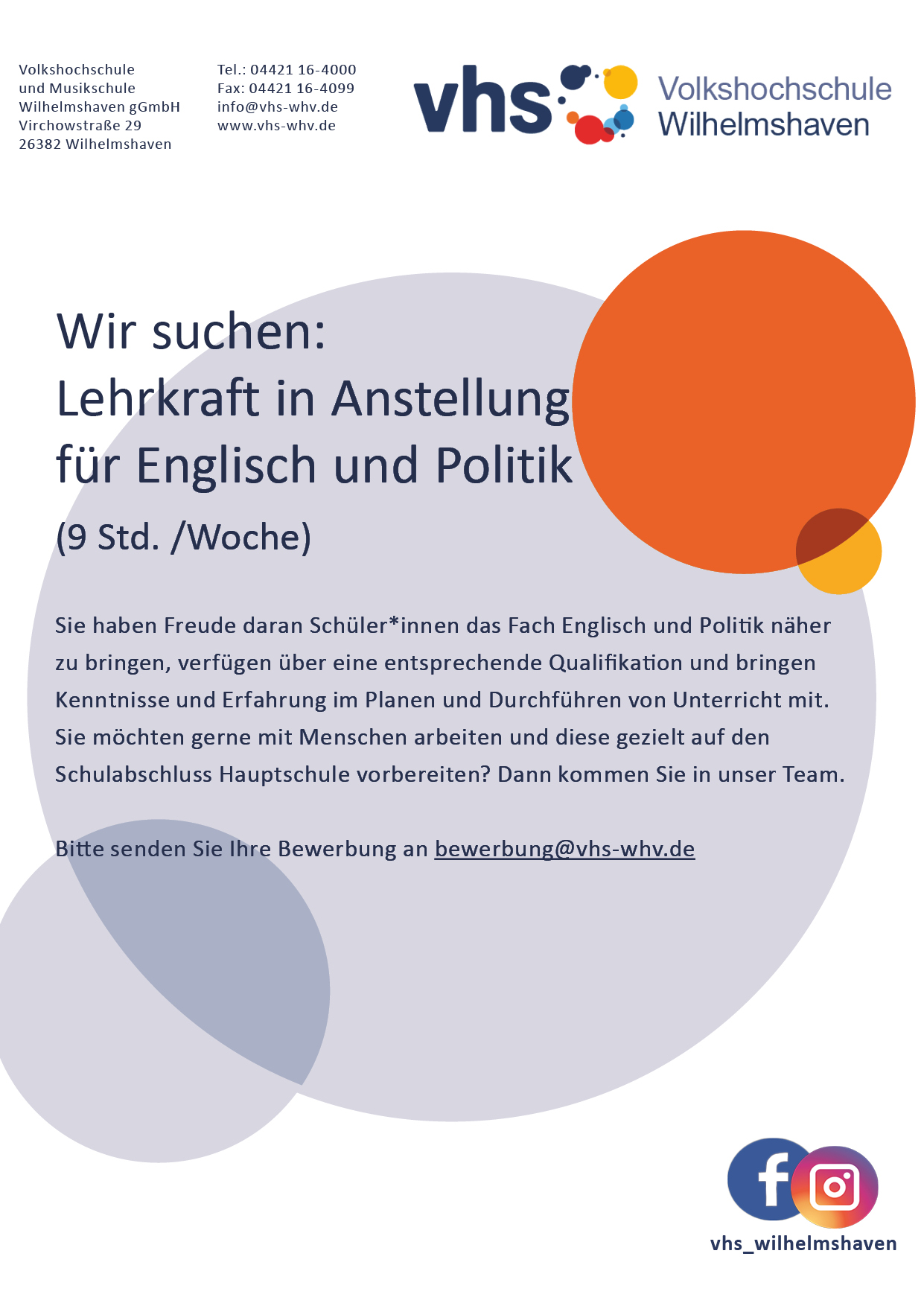 Initiativbewerbungen richten Sie bitte per E-Mail an: bewerbung@vhs-whv.de